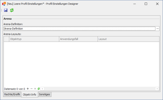 Über die Schaltfläche wird der Configuration-Explorer mit den Arena Definitionen geöffnet und die gewünschte Arena Definition ausgewählt. Beim Laden einer neuen ArenaConfiguration wird eine Liste von Objekttypen der ArenaLayoutConfigurationen automatisch generiert, je nachdem welche Objekttypen und Layouts bereits in der ArenaConfiguration definiert sind. Die Auswahl erfolgt über die Tabelle Arena-Layouts. |