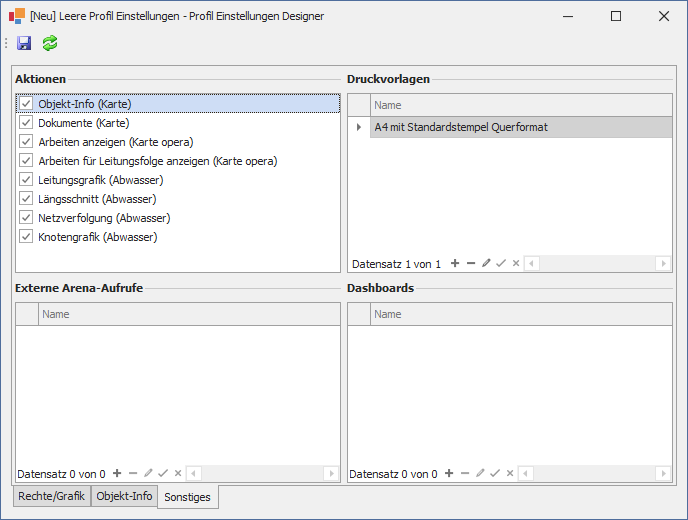 Auswahl, welches Arena-Layout für welchen Objekttyp verwendet werden soll, z.B. Abwasser/Haltung, Abwasser/Schacht. Über die Schaltflächenleiste werden die Arena-Layouts den Objekttypen zugewiesen.