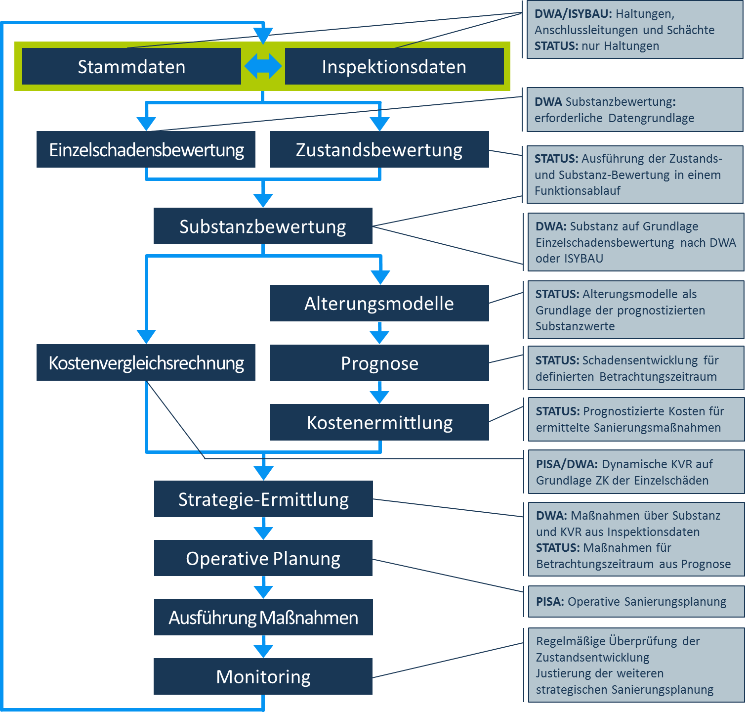 Der Workflow zur Abarbeitung der einzelnen Aufgaben ergibt sich durch Anforderungen an die strategische Sanierungsplanung. Beispielsweise ist, für eine reine Betrachtung auf Grundlage der aktuellen Inspektionsdaten, keine Prognose erforderlich. Für eine vorausschauende Sanierungsplanung, die sich auf einen Zeitraum größer 20 Jahre bezieht, ist die Erstellung von Alterungsmodellen zwingend erforderlich. Die einzelnen Schritte werden in der Schema-Zeichnung dargestellt. Voraussetzung für die weitere Ausführung der meisten Funktionen sind ausreichende Ergebnisse der vorhergehenden Berechnung. Z. B. kann eine Substanzbewertung nur auf Basis einer erfolgten Zustandsbewertung ausgeführt werden.