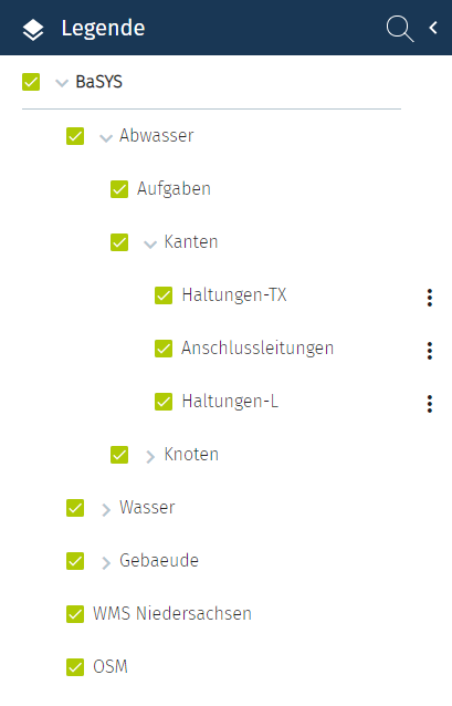 Wurde der Suchtext in der Layerbezeichnung gefunden, werden nur die Layer im Legendenpanel eingeblendet, die den Suchtext enthalten. Alle anderen Layer werden im Legendenpanel nicht angezeigt.