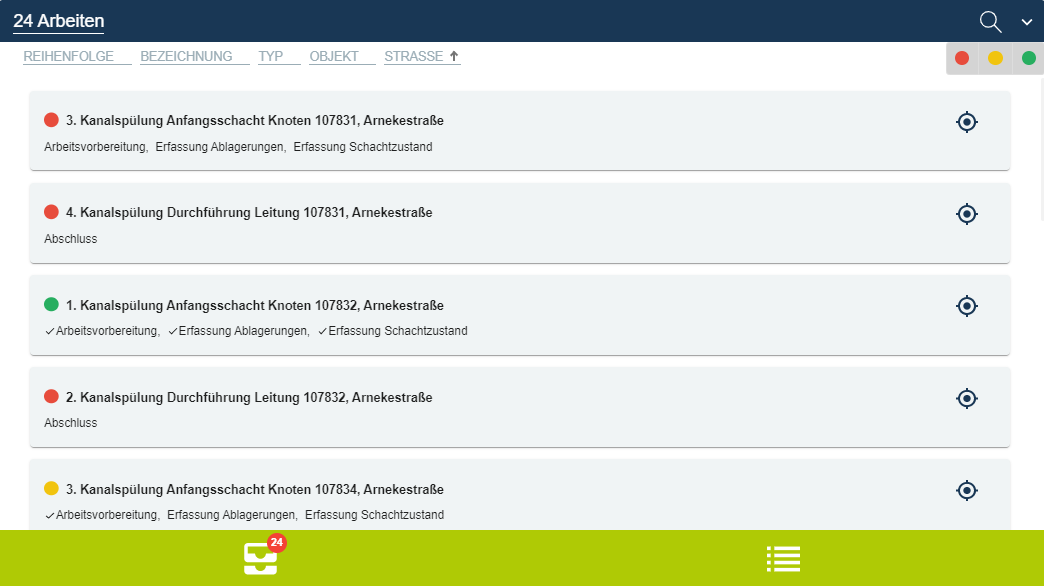 Über die Sortierleiste und den Statusfilter kann die Anzeige der Arbeiten individuell eingestellt werden.