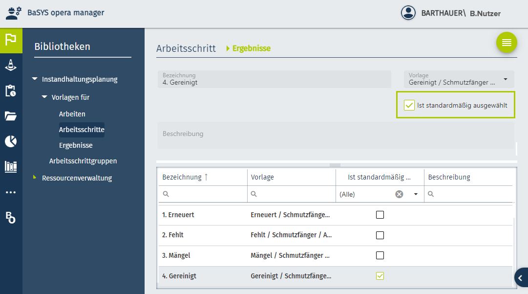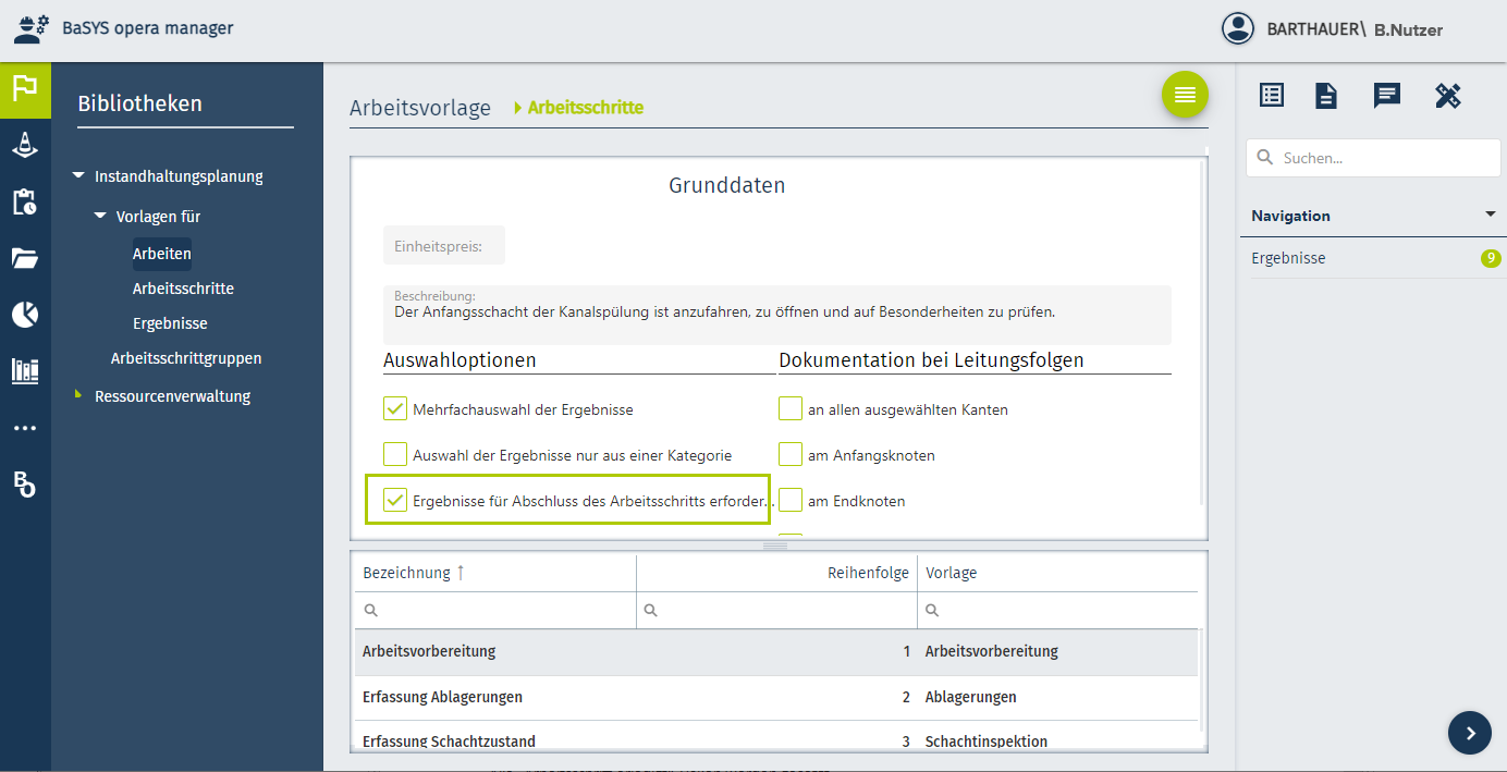 - alle Arbeitsschritte in BaSYS opera manager mit der Option „Ergebnisse für Abschluss des Arbeitsschritts erforderlich“Option „Ergebnisse für Abschluss des Arbeitsschritts erforderlich“ mindestens ein Ergebnis mit „Ist standardmäßig ausgewählt“ haben