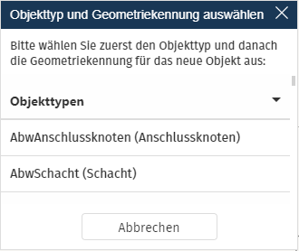 Wurde im Grafik-Modelldesigner nur ein Objekttyp (z.B. AbwSchacht) für die Knotenobjekterstellung konfiguriert, wird das Fenster Objekttyp wählen übersprungen und gleich das Fenster Kennung wählen angezeigt. |