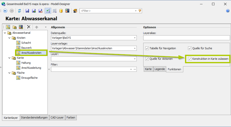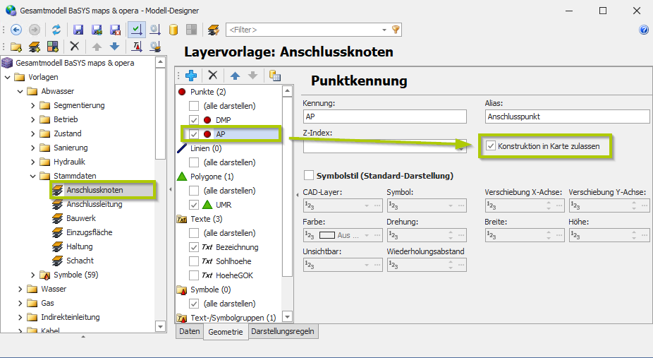 Zudem ist in der Layervorlage für jeden Objekttyp die entsprechende Geometriekennung auszuwählen und die Option"Konstruktion in Karte zulassen""Konstruktion in Karte zulassen" zu aktivieren.