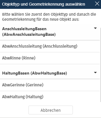 Wurde im Grafik-Modelldesigner nur ein Objekttyp (z.B. AbwHaltung) für die Linienobjekterstellung konfiguriert, wird das Fenster Objekttyp wählen übersprungen und gleich das Fenster Kennung wählen angezeigt. |