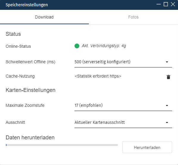 Über die Speichereinstellungen im Register Download werden die Optionen für den Offline-Betrieb gesetzt und die Daten heruntergeladen.