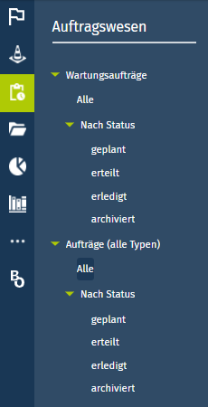 In der Navigationsgruppe stehen die Formulare mit verschiedenen Filtern gemäß Status der Aufträge zur Verfügung und können so vorgefiltert aufgerufen werden. Folgende Filter sind jeweils vorhanden: