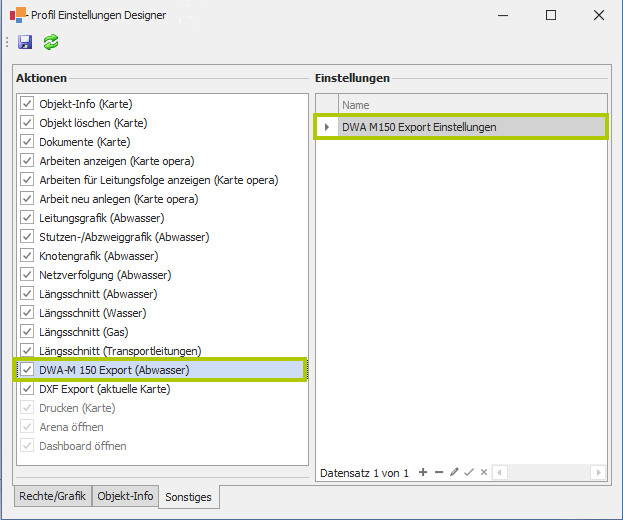 Dazu wird für das ausgewählte Profil im Register Sonstiges für die AktionDWA-M 150 Export (Abwasser) die zugehörigeKonfiguration ausgewählt: