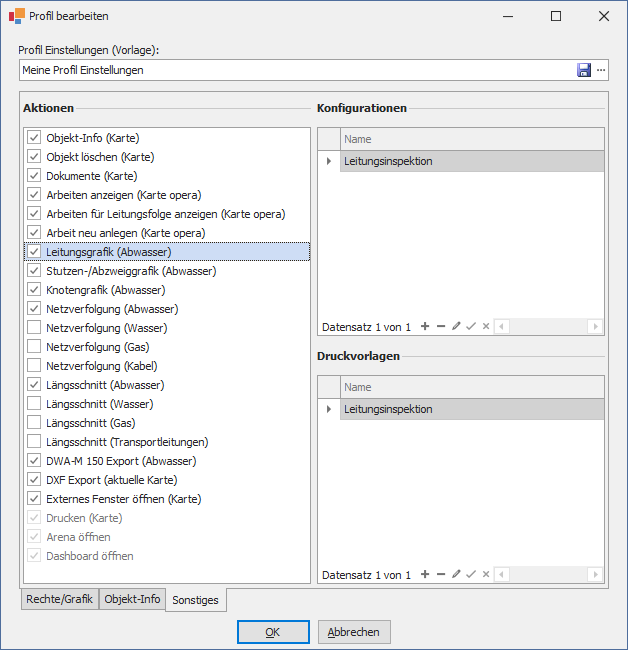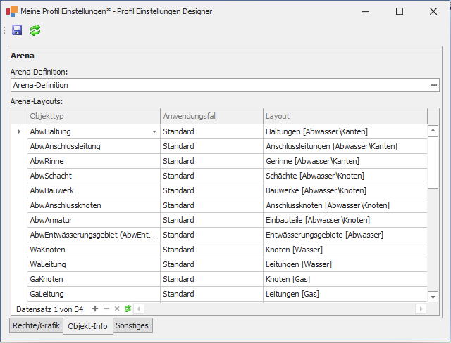 Auswahl, welches Arena-Layout für welchen Objekttyp verwendet werden soll, z.B. Abwasser/Haltung, Abwasser/Schacht. Über die Schaltflächenleiste werden die Arena-Layouts den Objekttypen zugewiesen.