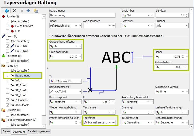 Um die Funktion nutzen zu können, muss die Gruppenbeschriftung für die relevanten Texte im verwendeten Grafikmodell (Einstellungen im Grafikmodell)(Einstellungen im Grafikmodell) aktiviert werden.